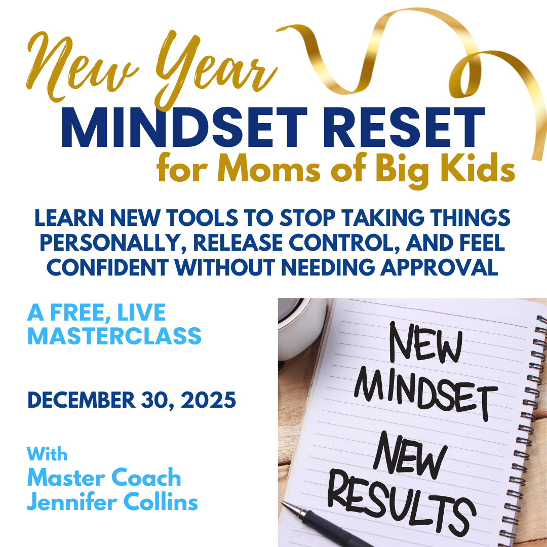 This live coaching masterclass is for moms of teens, college kids, and adult children who are ready to start the new year feeling more confident to navigate the emotional ups and downs of this stage of motherhood. You’ll learn how common mindset traps like taking things personally, trying to control outcomes, and needing approval drain your peace — and how to step out of them in a way that actually works in real life. You’ll walk away with a new way of responding — one that helps you feel present, confident and even more connected as you move into the year ahead.